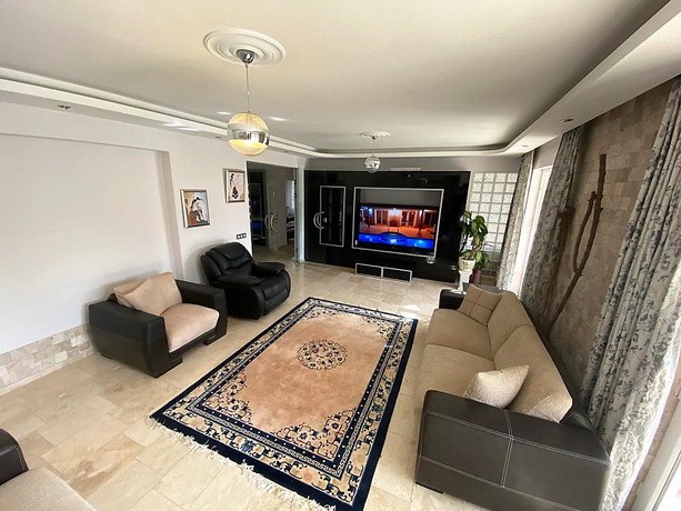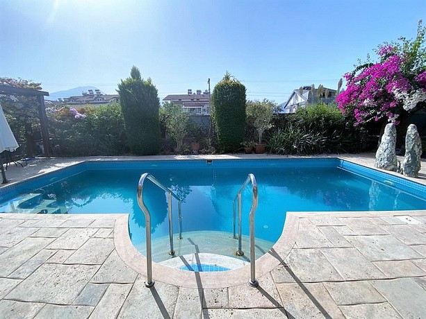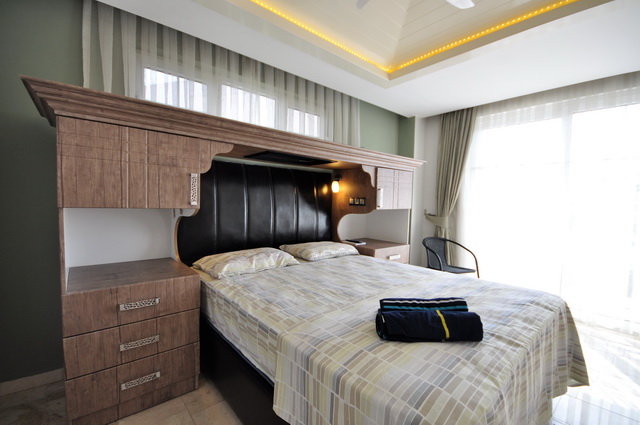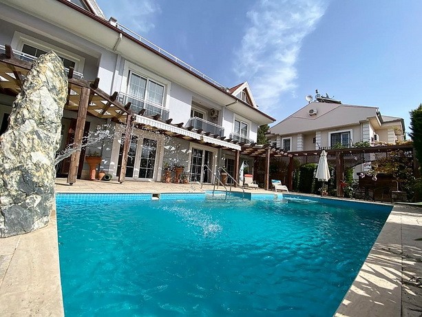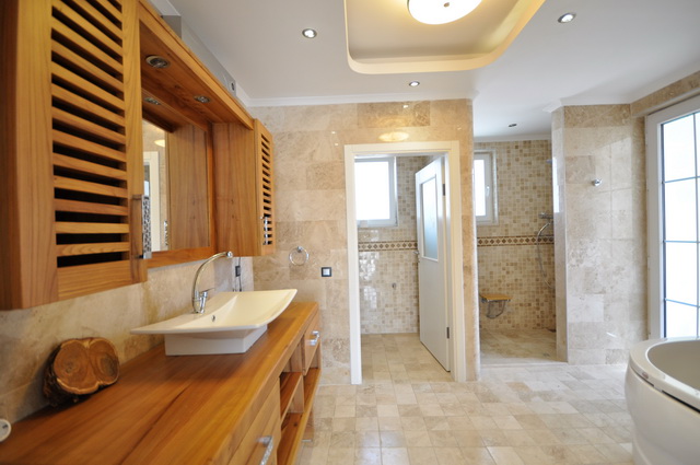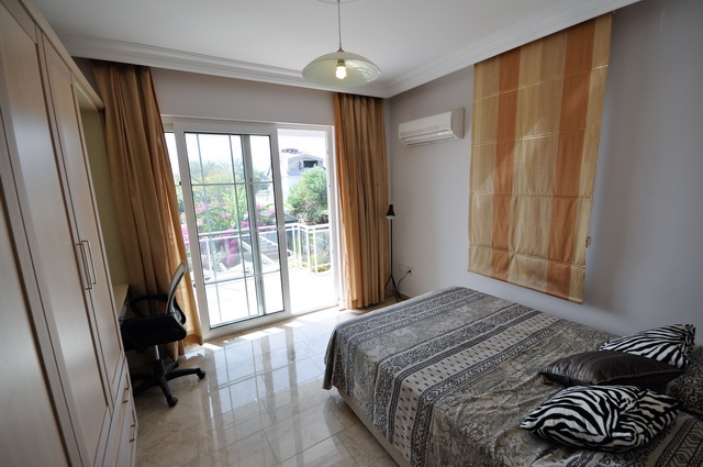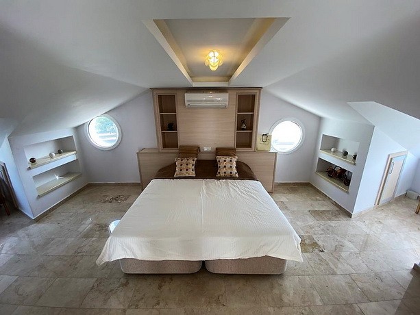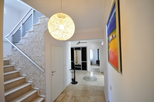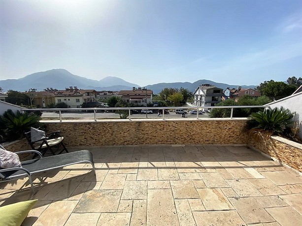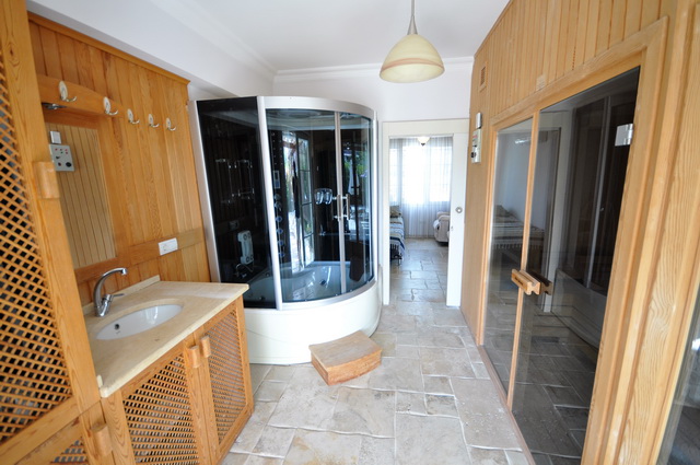 The marble staircase leads you to a hallway which has 2 large double bedrooms a family bathroom and separate Utility room with shower and side balcony. The master bedroom has its own separate private office, it comes with fully fitted wardrobes and a large en-suite bathroom complete with a jacuzzi bath tub and an enclosed side balcony , there is also a front balcony/terrace overlooking the swimming pool with slight sea views of Fethiye. The two other double bedrooms are large and generous with one having a private balcony again with slight sea views .
